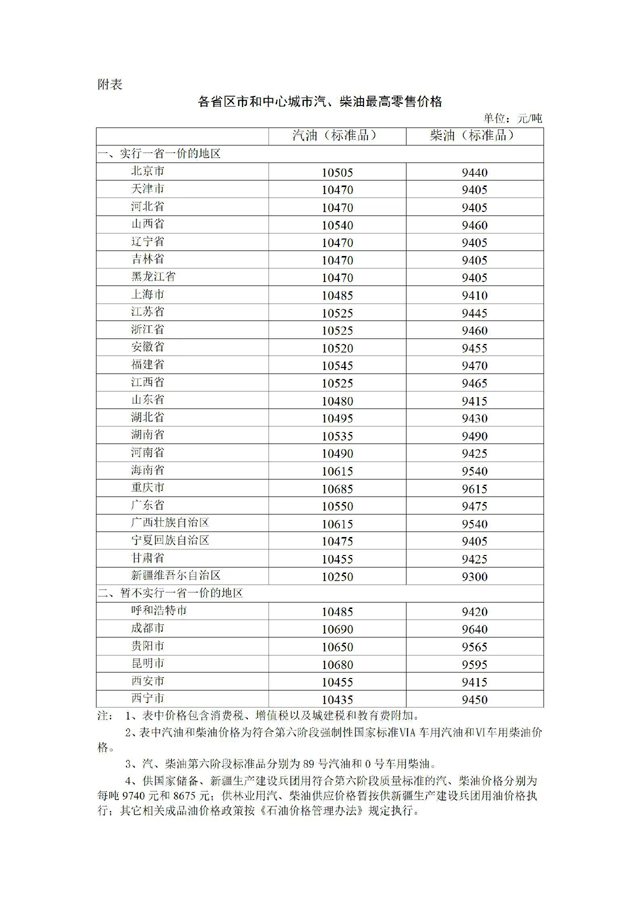 附:各省區(qū)市和中心城市汽、柴油最高零售價格