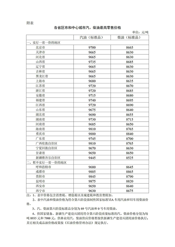 附:各省區(qū)市和中心城市汽、柴油最高零售價(jià)格