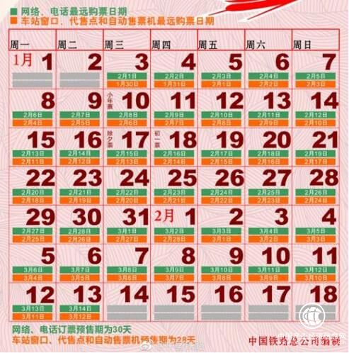 根據(jù)中國(guó)鐵路總公司編制的“2018年鐵路春運(yùn)購(gòu)票日歷”,2018年春運(yùn)自2月1日開(kāi)始,3月12日結(jié)束。1月3日,春運(yùn)首日火車票將正式開(kāi)始預(yù)售。