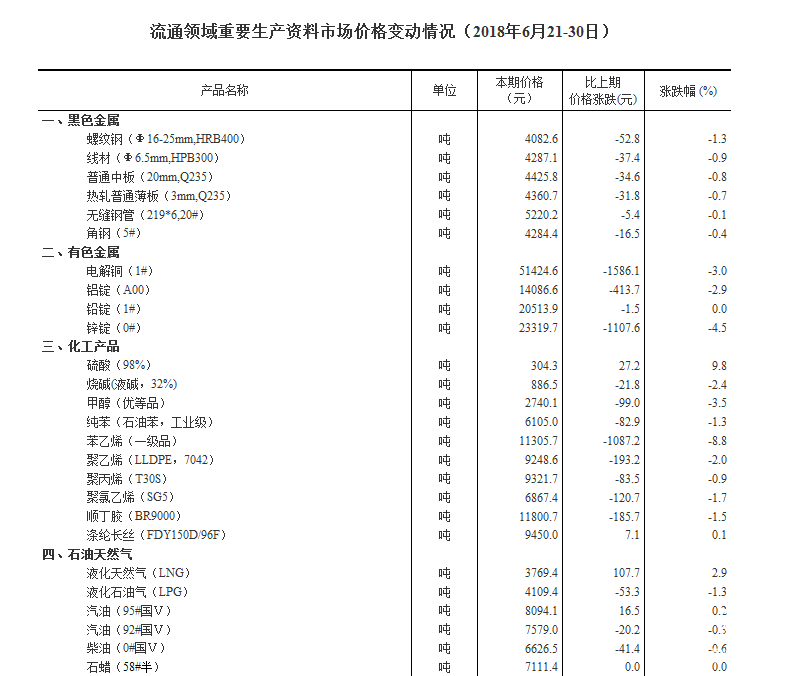 7月4日從統(tǒng)計局網(wǎng)站獲悉,據(jù)對24個?。▍^(qū)、市)流通領(lǐng)域9大類50種重要生產(chǎn)資料市場價格的監(jiān)測顯示,2018年6月下旬與6月中旬相比,13種產(chǎn)品價格上漲,30種下降,7種持平。