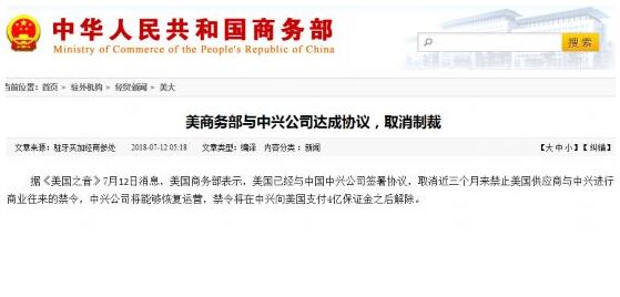 商務(wù)部網(wǎng)站7月12日消息顯示,據(jù)《美國之音》7月12日消息,美國商務(wù)部表示,美國已經(jīng)與中國中興公司簽署協(xié)議,取消近三個(gè)月來禁止美國供應(yīng)商與中興進(jìn)行商業(yè)往來的禁令,中興公司將能夠恢復(fù)運(yùn)營,禁令將在中興向美國支付4億保證金之后解除。