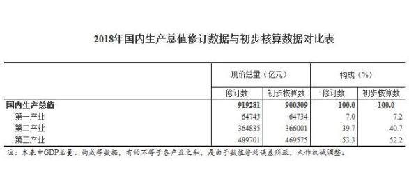 據國家統(tǒng)計局網站消息,依據中國國內生產總值(GDP)核算制度和第四次全國經濟普查結果,國家統(tǒng)計局對2018年國內生產總值初步核算數進行了修訂。主要結果為:2018年國內生產總值為919281億元,比初步核算數增加18972億元,增幅為2.1%。