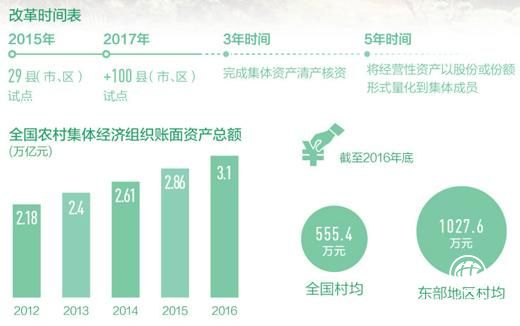 2014年9月,中央全面深化改革領(lǐng)導(dǎo)小組第五次會(huì)議審議了《積極發(fā)展農(nóng)民股份合作賦予集體資產(chǎn)股份權(quán)能改革試點(diǎn)方案》。2015年29個(gè)縣市區(qū)參與改革試點(diǎn),2017年新增100個(gè)試點(diǎn)。2017年開始,將用3年基本完成集體資產(chǎn)清產(chǎn)核資,再用5年基本完成經(jīng)營性資產(chǎn)股份合作制改革,將經(jīng)營性資產(chǎn)以股份或份額形式量化到集體成員。兩年多來,集體家底更清晰了,群眾心里更明白了,發(fā)展集體經(jīng)濟(jì)的勁頭更足了。