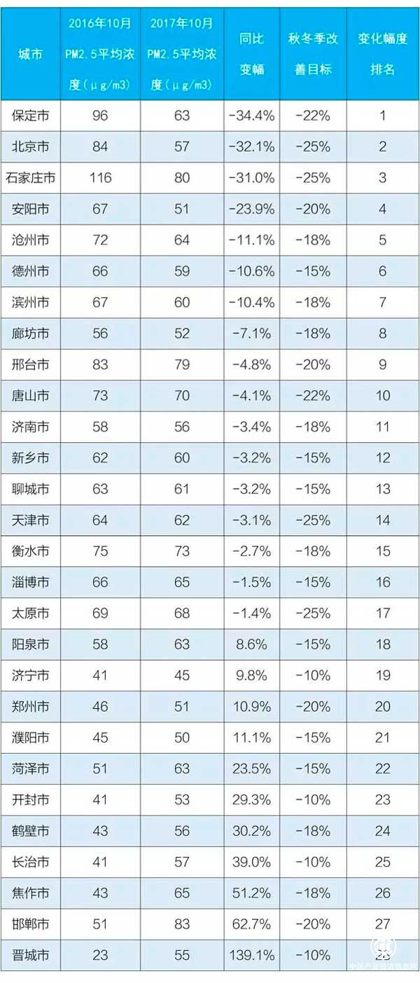 環(huán)境保護(hù)部公布的這份《關(guān)于通報(bào)京津冀大氣污染傳輸通道城市2017年10月環(huán)境空氣質(zhì)量有關(guān)情況的函》,對(duì)“2+26”城市10月細(xì)顆粒物(PM2.5)平均濃度和同比變化幅度分別進(jìn)行了排名。