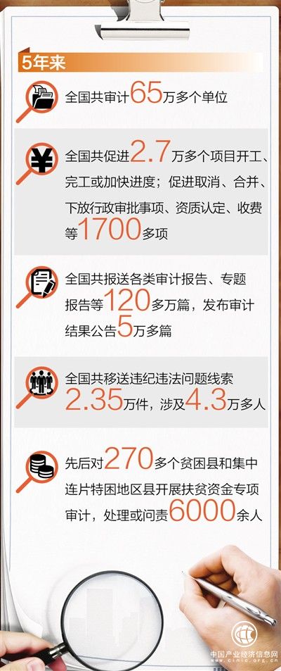 據(jù)了解,5年來,全國共審計(jì)65萬多個(gè)單位,促進(jìn)增收節(jié)支和挽回?fù)p失2.5萬億元,推動(dòng)健全完善制度2.38萬項(xiàng),移送違紀(jì)違法問題線索2.35萬件。具體來說: