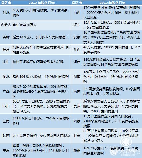 2017年,全國(guó)千萬(wàn)人口脫貧,9省區(qū)市的26個(gè)貧困縣順利通過(guò)了國(guó)家專項(xiàng)評(píng)估檢查,將由省級(jí)人民政府陸續(xù)批準(zhǔn)退出貧困縣。2018年是脫貧攻堅(jiān)的關(guān)鍵年,各地將繼續(xù)做好精準(zhǔn)脫貧工作,據(jù)記者不完全統(tǒng)計(jì),在地方兩會(huì)上至少22省區(qū)市將2018年的具體脫貧目標(biāo)寫入政府工作報(bào)告(見下表)。