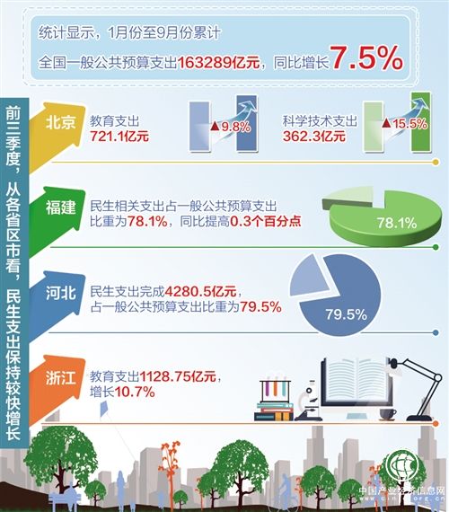從各省區(qū)市看,民生支出保持較快增長。比如,前三季度,北京市教育支出721.1億元,同比增長9.8%;科學(xué)技術(shù)支出362.3億元,同比增長15.5%;醫(yī)療衛(wèi)生與計劃生育支出369.8億元,同比增長17.3%。