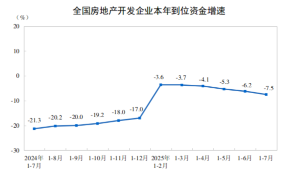 1—7月份,房地產(chǎn)開發(fā)企業(yè)到位資金57287億元,同比下降7.5%。其中,國內(nèi)貸款9207億元,增長0.1%;利用外資17億元,增長3.2%;自籌資金23230億元,下降8.5%;定金及預(yù)收款16815億元,下降9.9%;個人按揭貸款7918億元,下降9.3%。