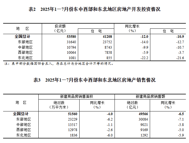 1—7月份,全國房地產(chǎn)開發(fā)投資53580億元,同比下降12.0%(按可比口徑計算,詳見附注6);其中,住宅投資41208億元,下降10.9%。