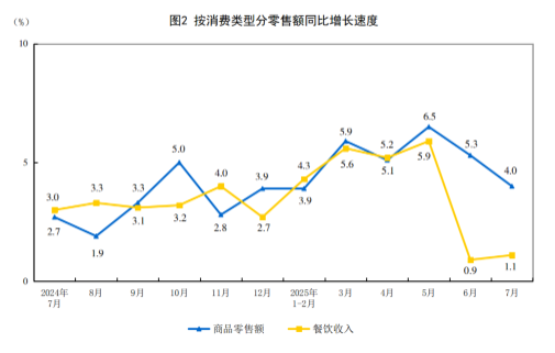 按消費類型分,7月份,商品零售額34276億元,同比增長4.0%;餐飲收入4504億元,增長1.1%。1—7月份,商品零售額252254億元,增長4.9%;餐飲收入31984億元,增長3.8%。