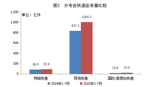1—7月,同城快遞業(yè)務(wù)量累計完成92.6億件,同比增長6.5%;異地快遞業(yè)務(wù)量累計完成1004.3億件,同比增長19.9%;國際/港澳臺快遞業(yè)務(wù)量累計完成23.6億件,同比增長19.2%。