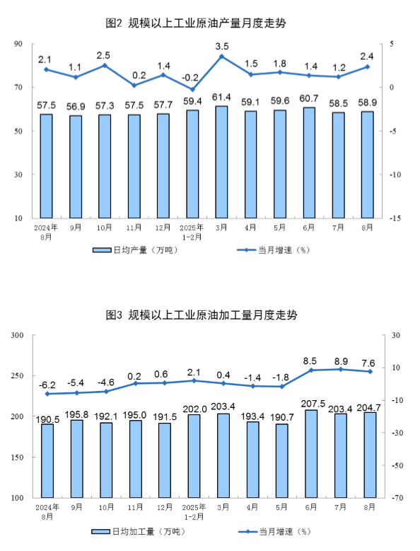 原油加工較快增長(zhǎng)。8月份,規(guī)上工業(yè)原油加工量6346萬(wàn)噸,同比增長(zhǎng)7.6%;日均加工204.7萬(wàn)噸。
