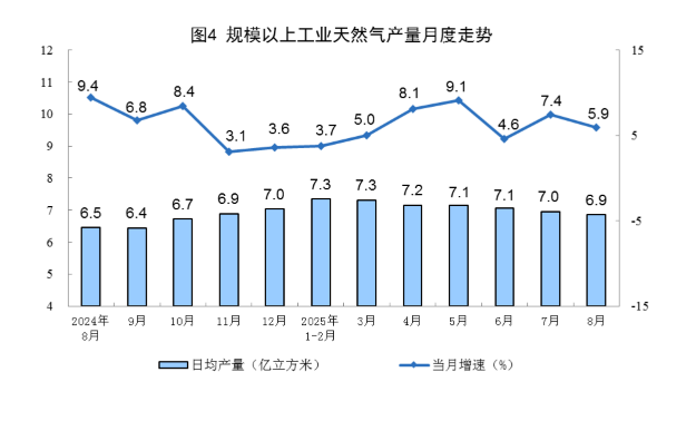 天然氣生產(chǎn)穩(wěn)定增長(zhǎng)。8月份,規(guī)上工業(yè)天然氣產(chǎn)量212億立方米,同比增長(zhǎng)5.9%;日均產(chǎn)量6.9億立方米。