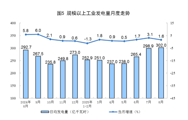 規(guī)上工業(yè)電力生產(chǎn)平穩(wěn)增長(zhǎng)。8月份,規(guī)上工業(yè)發(fā)電量9363億千瓦時(shí),同比增長(zhǎng)1.6%;日均發(fā)電首次突破300億千瓦時(shí),達(dá)302.0億千瓦時(shí)。1—8月份,規(guī)上工業(yè)發(fā)電量64193億千瓦時(shí),同比增長(zhǎng)1.5%,扣除天數(shù)原因,日均發(fā)電量同比增長(zhǎng)1.9%。