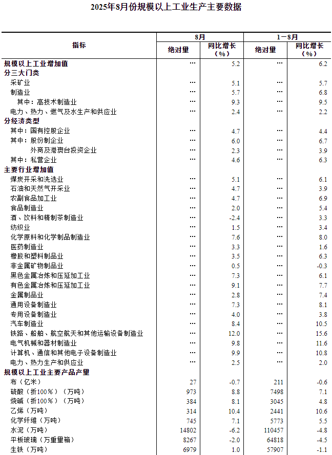 8月份,規(guī)模以上工業(yè)增加值同比實際增長5.2%(增加值增速均為扣除價格因素的實際增長率)。從環(huán)比看,8月份,規(guī)模以上工業(yè)增加值比上月增長0.37%。1—8月份,規(guī)模以上工業(yè)增加值同比增長6.2%。