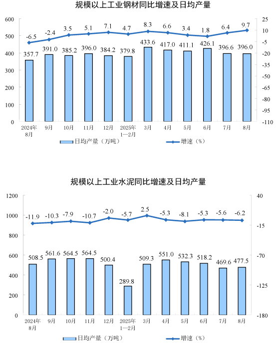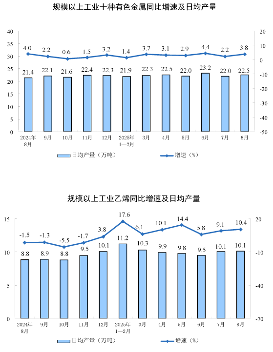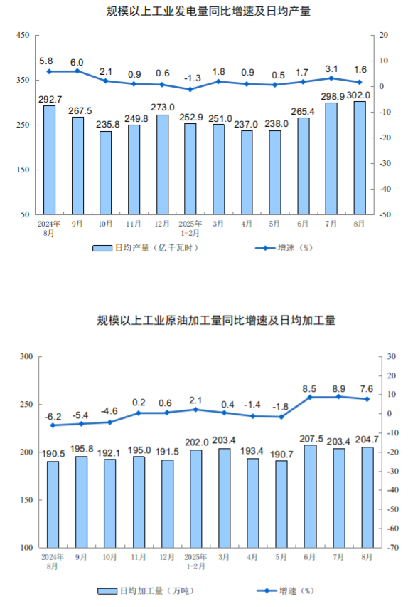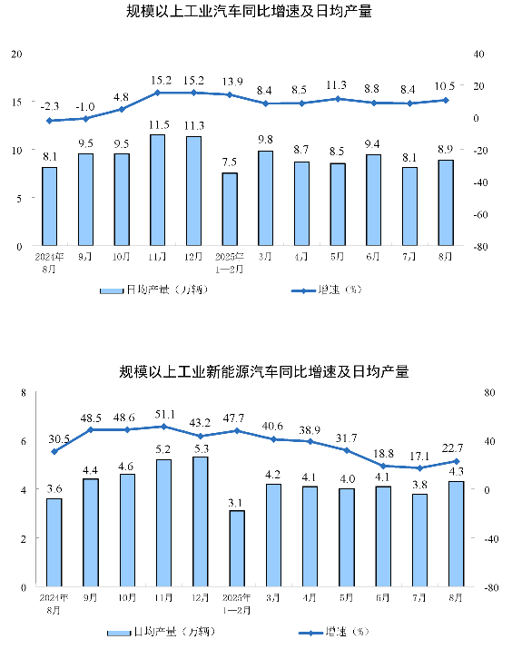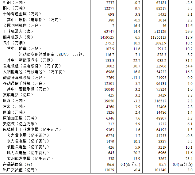 分產(chǎn)品看,8月份,規(guī)模以上工業(yè)623種產(chǎn)品中有319種產(chǎn)品產(chǎn)量同比增長。其中,鋼材12277萬噸,同比增長9.7%;水泥14802萬噸,下降6.2%;十種有色金屬698萬噸,增長3.8%;乙烯314萬噸,增長10.4%;汽車275.2萬輛,增長10.5%,其中新能源汽車133.3萬輛,增長22.7%;發(fā)電量9363億千瓦時,增長1.6%;原油加工量6346萬噸,增長7.6%。