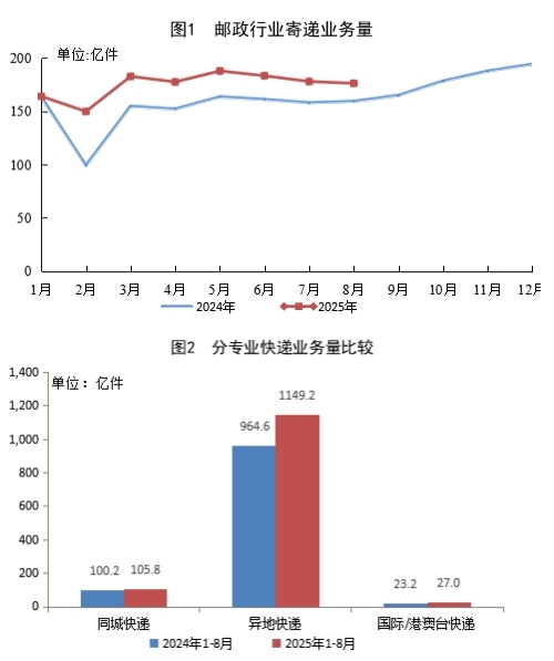 8月份,郵政行業(yè)寄遞業(yè)務(wù)量完成176.2億件,同比增長(zhǎng)10.5%。其中,快遞業(yè)務(wù)量完成161.5億件,同比增長(zhǎng)12.3%。