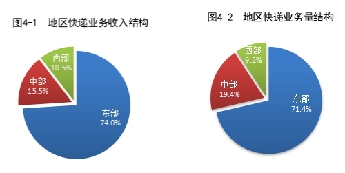 1-8月,東、中、西部地區(qū)快遞業(yè)務(wù)收入比重分別為74.0%、15.5%和10.5%,快遞業(yè)務(wù)量比重分別為71.4%、19.4%和9.2%。與去年同期相比,東部地區(qū)快遞業(yè)務(wù)收入比重下降0.8個(gè)百分點(diǎn),快遞業(yè)務(wù)量比重下降1.4個(gè)百分點(diǎn);中部地區(qū)快遞業(yè)務(wù)收入比重上升0.5個(gè)百分點(diǎn),快遞業(yè)務(wù)量比重上升0.9個(gè)百分點(diǎn);西部地區(qū)快遞業(yè)務(wù)收入比重上升0.3個(gè)百分點(diǎn),快遞業(yè)務(wù)量比重上升0.5個(gè)百分點(diǎn)。