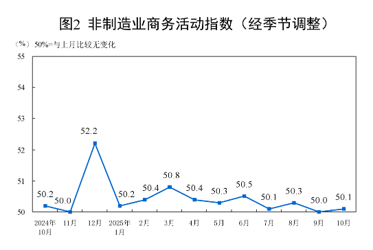 10月份,非制造業(yè)商務(wù)活動(dòng)指數(shù)為50.1%,比上月上升0.1個(gè)百分點(diǎn),升至擴(kuò)張區(qū)間。