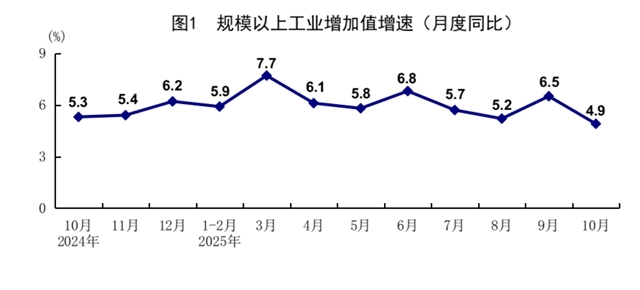 10月份,全國規(guī)模以上工業(yè)增加值同比增長4.9%,環(huán)比增長0.17%。分三大門類看,采礦業(yè)增加值同比增長4.5%,制造業(yè)增長4.9%,電力、熱力、燃氣及水生產(chǎn)和供應業(yè)增長5.4%。裝備制造業(yè)增加值同比增長8.0%,高技術制造業(yè)增加值增長7.2%,分別快于全部規(guī)模以上工業(yè)增加值3.1和2.3個百分點。分經(jīng)濟類型看,國有控股企業(yè)增加值同比增長6.7%;股份制企業(yè)增長5.2%,外商及港澳臺投資企業(yè)增長4.0%;私營企業(yè)增長2.1%。分產(chǎn)品看,3D打印設備、新能源汽車、工業(yè)機器人產(chǎn)品產(chǎn)量同比分別增長30.8%、19.3%、17.9%。1—10月份,全國規(guī)模以上工業(yè)增加值同比增長6.1%。10月份,制造業(yè)采購經(jīng)理指數(shù)為49.0%,企業(yè)生產(chǎn)經(jīng)營活動預期指數(shù)為52.8%。1—9月份,全國規(guī)模以上工業(yè)企業(yè)實現(xiàn)利潤總額53732億元,同比增長3.2%。