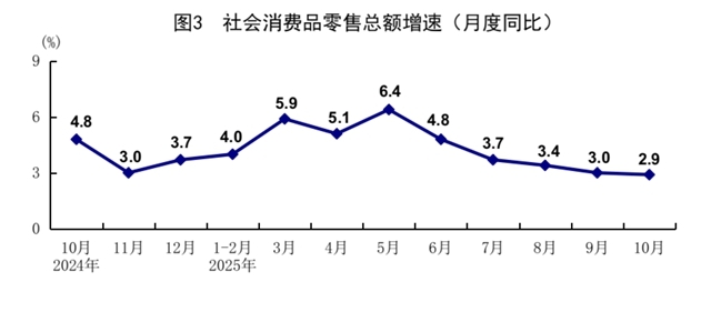 10月份,社會消費品零售總額46291億元,同比增長2.9%;環(huán)比增長0.16%。按經(jīng)營單位所在地分,城鎮(zhèn)消費品零售額40021億元,同比增長2.7%;鄉(xiāng)村消費品零售額6270億元,增長4.1%。按消費類型分,商品零售額41092億元,增長2.8%;餐飲收入5199億元,增長3.8%。基本生活類和部分升級類消費較快增長,限額以上單位糧油食品類、通訊器材類、文化辦公用品類、體育娛樂用品類商品零售額同比分別增長9.1%、23.2%、13.5%、10.1%。1—10月份,社會消費品零售總額412169億元,同比增長4.3%。全國網(wǎng)上零售額127916億元,同比增長9.6%。其中,實物商品網(wǎng)上零售額103984億元,增長6.3%,占社會消費品零售總額的比重為25.2%。1—10月份,服務零售額同比增長5.3%,增速比前三季度加快0.1個百分點。其中,文體休閑服務類、通訊信息服務類、旅游咨詢租賃服務類、交通出行服務類零售額較快增長。