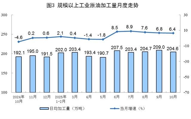 原油加工平穩(wěn)增長。10月份,規(guī)上工業(yè)原油加工量6343萬噸,同比增長6.4%;日均加工204.6萬噸。