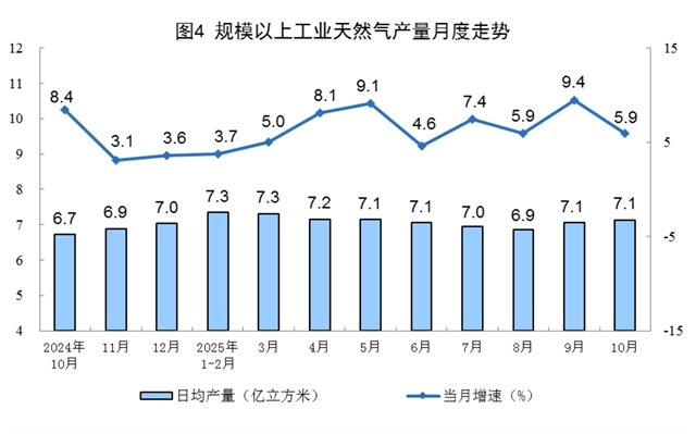 天然氣生產(chǎn)增速放緩。10月份,規(guī)上工業(yè)天然氣產(chǎn)量221億立方米,同比增長5.9%,增速比9月份放緩3.5個百分點;日均產(chǎn)量7.1億立方米。