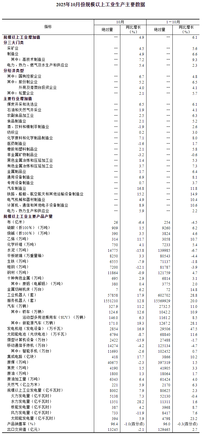 分三大門類看,10月份,采礦業(yè)增加值同比增長(zhǎng)4.5%,制造業(yè)增長(zhǎng)4.9%,電力、熱力、燃?xì)饧八a(chǎn)和供應(yīng)業(yè)增長(zhǎng)5.4%。