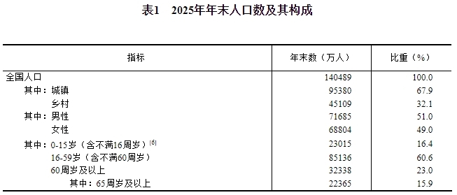 [6]2025年末,0-14歲(含不滿15周歲)人口為21276萬人,15-59歲(含不滿60周歲)人口為86875萬人。