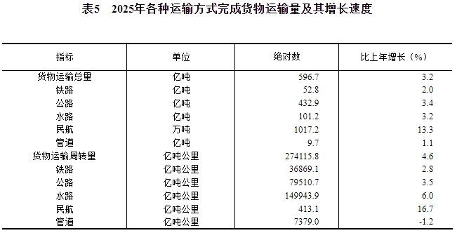 [31]貨物運輸總量及周轉(zhuǎn)量包括鐵路、公路、水路、民航和管道五種運輸方式完成量,2025年增速按可比口徑計算。