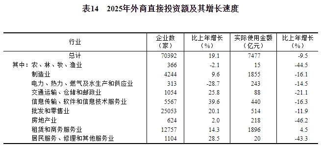 全年新設(shè)立外商投資企業(yè)70392家,比上年增長19.1%。實際使用外資金額7477億元,下降9.5%。其中,共建“一帶一路”國家(含通過部分自由港對華投資)對華新設(shè)立外商投資企業(yè)19756家,增長14.7%;對華直接投資1168億元,增長1.9%。高技術(shù)產(chǎn)業(yè)實際使用外資2418億元,下降15.6%。