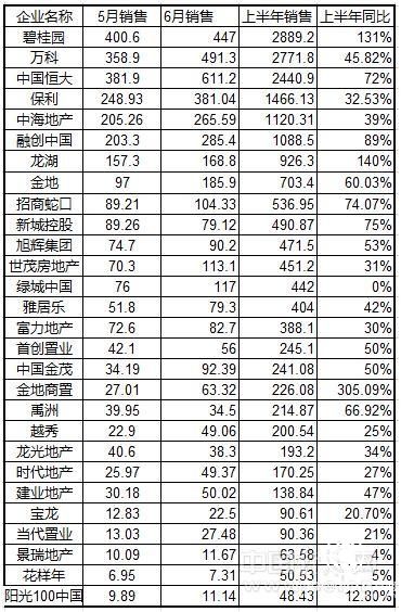 在經(jīng)歷了5月份銷售低潮后,6月份房企沖刺半年報,整體銷售業(yè)績均有明顯提高。中國經(jīng)濟網(wǎng)注意到,雖然整體數(shù)據(jù)樂觀,但不同企業(yè)分化加劇,碧桂園、萬科、恒大、保利、中海、融創(chuàng)等企業(yè)半年銷售就超過千億,其中碧桂園同比漲幅達到了131%,而中小型企業(yè)的漲幅則明顯低于龍頭房企。