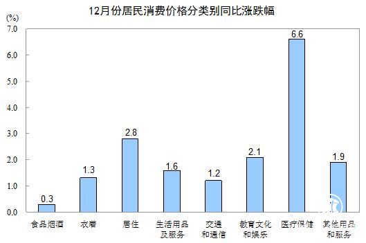 12月份,其他七大類價(jià)格同比均上漲。其中,醫(yī)療保健、居住、教育文化和娛樂價(jià)格分別上漲6.6%、2.8%和2.1%,其他用品和服務(wù)、生活用品及服務(wù)價(jià)格分別上漲1.9%和1.6%,衣著、交通和通信價(jià)格分別上漲1.3%和1.2%。