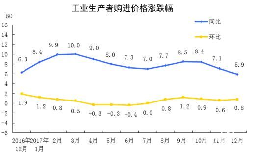 2017年12月份,全國工業(yè)生產(chǎn)者出廠價(jià)格同比上漲4.9%,環(huán)比上漲0.8%。工業(yè)生產(chǎn)者購進(jìn)價(jià)格同比上漲5.9%,環(huán)比上漲0.8%。2017年全年,工業(yè)生產(chǎn)者出廠價(jià)格同比上漲6.3%,工業(yè)生產(chǎn)者購進(jìn)價(jià)格同比上漲8.1%。