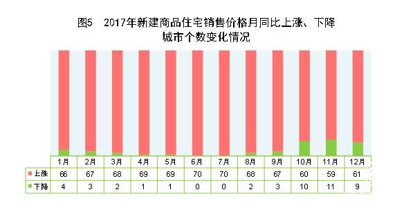 12月份70個大中城市新建商品住宅銷售價格月同比上漲的城市個數(shù)為61個,比1月份減少5個;下降的為9個,增加5個。