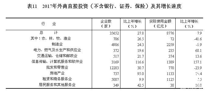 全年吸收外商直接投資(不含銀行、證券、保險)新設(shè)立企業(yè)35652家,比上年增長27.8%。實際使用外商直接投資金額8776億元(折1310億美元),增長7.9%,增速比上年加快3.8個百分點。其中“一帶一路”沿線國家對華直接投資新設(shè)立企業(yè)3857家,增長32.8%;對華直接投資金額374億元(折56億美元)。全年高技術(shù)制造業(yè)實際使用外資666億元,增長11.3%。