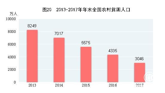 按照每人每年2300元(2010年不變價)的農(nóng)村貧困標(biāo)準(zhǔn)計算,2017年,年末農(nóng)村貧困人口3046萬人,比上年末減少1289萬人[53];貧困發(fā)生率[54]3.1%,比上年下降1.4個百分點。貧困地區(qū)[55]農(nóng)村居民人均可支配收入9377元,比上年增長10.5%,扣除價格因素,實際增長9.1%。