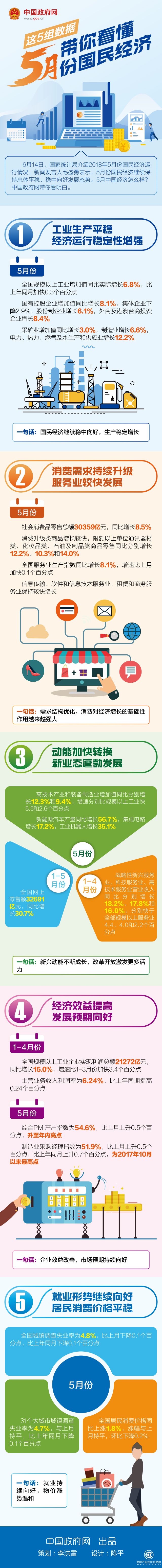 6月14日,國家統(tǒng)計(jì)局介紹2018年5月份國民經(jīng)濟(jì)運(yùn)行情況,新聞發(fā)言人毛盛勇表示,5月份國民經(jīng)濟(jì)繼續(xù)保持總體平穩(wěn)、穩(wěn)中向好發(fā)展態(tài)勢。5月中國經(jīng)濟(jì)怎么樣?5組數(shù)據(jù)帶你看明白。