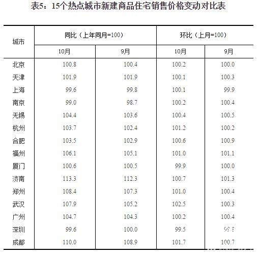 10月份,15個(gè)熱點(diǎn)城市新建商品住宅銷售價(jià)格環(huán)比下降的城市有2個(gè),與上月相同,最大降幅為0.5%;上漲的13個(gè),增加 2個(gè),最高漲幅為2.5%。同比下降的城市有3個(gè),比上月增加1個(gè),最大降幅為1.0%;上漲的12個(gè),與上月相同,最高漲幅為13.3%。