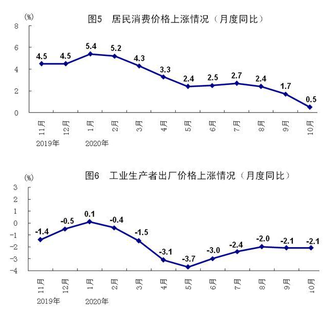 10月份,全國(guó)工業(yè)生產(chǎn)者出廠價(jià)格同比下降2.1%,降幅與9月份持平;環(huán)比持平。工業(yè)生產(chǎn)者購(gòu)進(jìn)價(jià)格同比下降2.4%,降幅比9月份擴(kuò)大0.1個(gè)百分點(diǎn);環(huán)比上漲0.2%。1-10月份,全國(guó)工業(yè)生產(chǎn)者出廠價(jià)格和工業(yè)生產(chǎn)者購(gòu)進(jìn)價(jià)格同比分別下降2.0%、2.6%。