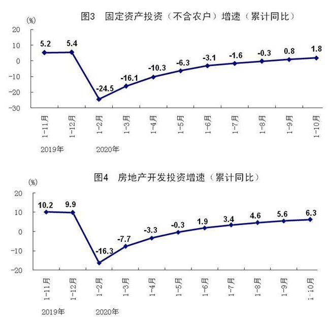 1-10月份,全國(guó)固定資產(chǎn)投資(不含農(nóng)戶)同比增長(zhǎng)1.8%,比1-9月份加快1.0個(gè)百分點(diǎn);10月份環(huán)比增長(zhǎng)3.22%。分領(lǐng)域看,基礎(chǔ)設(shè)施投資同比增長(zhǎng)0.7%,比1-9月份加快0.5個(gè)百分點(diǎn);制造業(yè)投資下降5.3%,降幅比1-9月份收窄1.2個(gè)百分點(diǎn);房地產(chǎn)開發(fā)投資增長(zhǎng)6.3%,比1-9月份加快0.7個(gè)百分點(diǎn)。全國(guó)商品房銷售面積133294萬平方米,同比持平,1-9月份為下降1.8%;商品房銷售額131665億元,增長(zhǎng)5.8%,比1-9月份加快2.1個(gè)百分點(diǎn)。分產(chǎn)業(yè)看,第一產(chǎn)業(yè)投資同比增長(zhǎng)17.3%,比1-9月份加快2.8個(gè)百分點(diǎn);第二產(chǎn)業(yè)投資下降2.1%,降幅比1-9月份收窄1.3個(gè)百分點(diǎn);第三產(chǎn)業(yè)投資增長(zhǎng)3.0%,比1-9月份加快0.7個(gè)百分點(diǎn)。高技術(shù)產(chǎn)業(yè)投資同比增長(zhǎng)9.7%,比1-9月份加快0.6個(gè)百分點(diǎn);其中高技術(shù)制造業(yè)和高技術(shù)服務(wù)業(yè)投資分別增長(zhǎng)10.0%、9.4%。高技術(shù)制造業(yè)中,醫(yī)藥制造業(yè)、計(jì)算機(jī)及辦公設(shè)備制造業(yè)投資分別增長(zhǎng)22.8%、14.8%;高技術(shù)服務(wù)業(yè)中,電子商務(wù)服務(wù)業(yè)、科技成果轉(zhuǎn)化服務(wù)業(yè)投資分別增長(zhǎng)26.5%、17.2%。社會(huì)領(lǐng)域投資同比增長(zhǎng)10.6%,其中衛(wèi)生、教育投資分別增長(zhǎng)24.1%、13.1%。