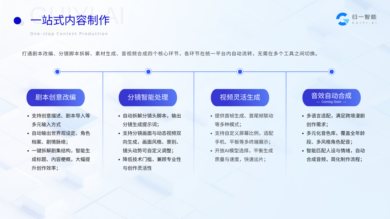 乘勢而上,聚力前行。歸一智能為漫劇出海市場量身打造的「AI漫劇超級產線」正式發(fā)布!入局AI漫劇出海賽道,不僅是對歸一智能技術實力的全面檢驗,更是釋放核心制作能力的重要里程碑。