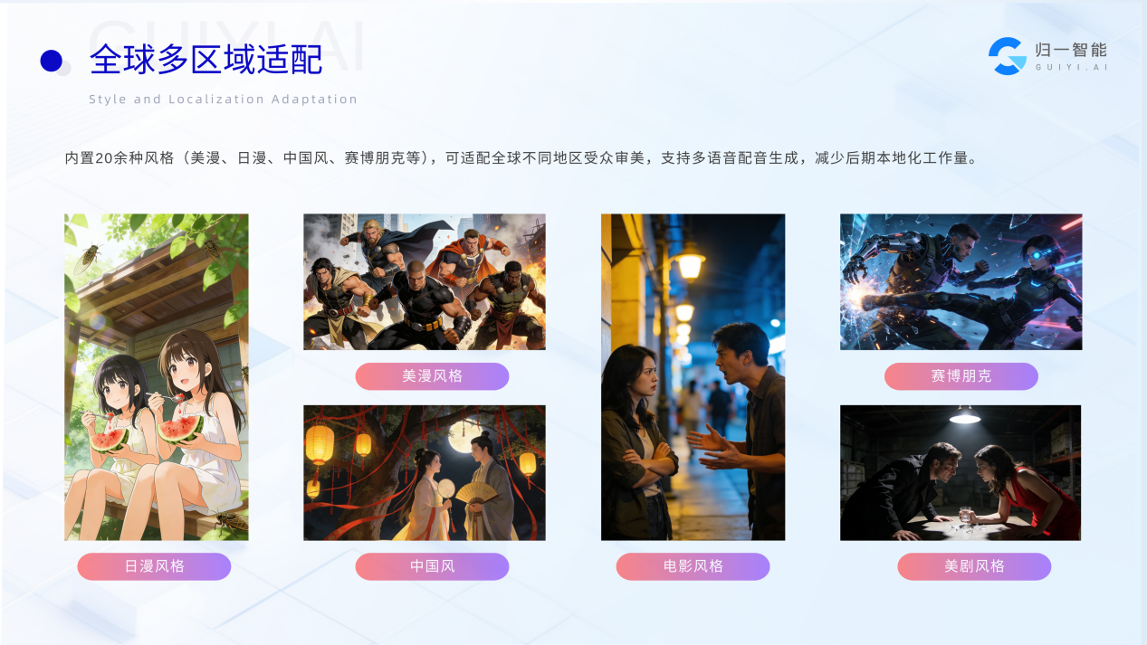 為滿足漫劇出海的全球化內容創(chuàng)作需求,歸一智能在「AI漫劇超級產線」中內置了 20 余種主流漫畫美術風格,涵蓋美漫、日漫、國風、賽博朋克、寫實、Q版等多種視覺體系,可針對不同地區(qū)、不同受眾的審美偏好進行精準適配,幫助創(chuàng)作者快速打造符合海外市場需求的AI漫劇內容。