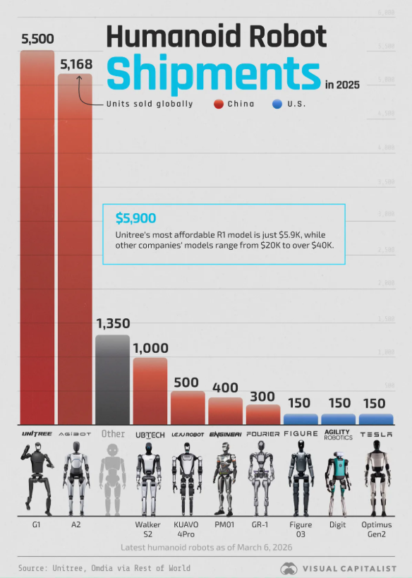 從企業(yè)出貨量份額來看,中國企業(yè)表現(xiàn)突出。根據(jù)中國電子報(bào)發(fā)布的《2025年人形機(jī)器人市場研究報(bào)告》,宇樹科技(Unitree)出貨量和市場份額在全球排名第一,2025年出貨量超過5500臺(tái)。此外,宇樹科技的產(chǎn)品在技術(shù)上也位居世界前列,價(jià)格也相對親民。例如,其最便宜的R1型號售價(jià)僅為5900美元,而該公司還出售售價(jià)1600美元的機(jī)器狗。