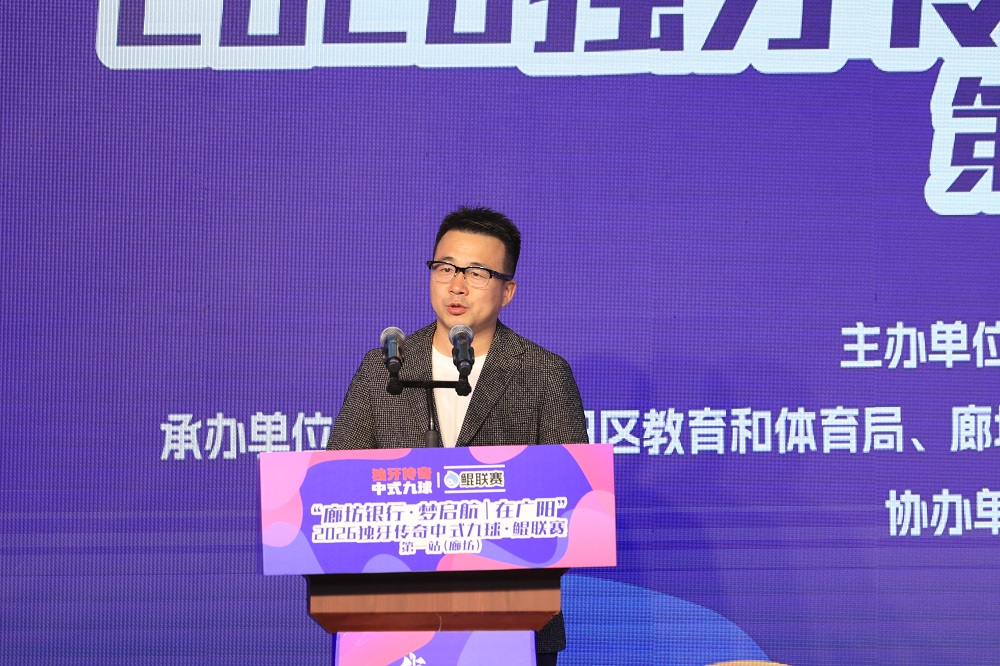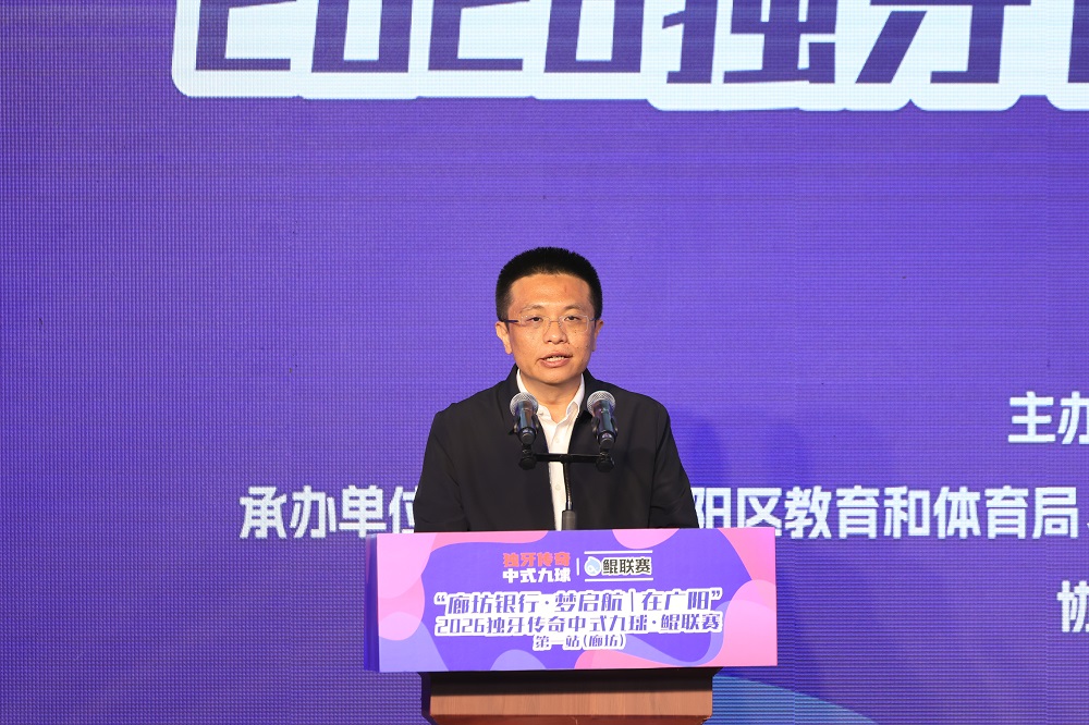 在致辭環(huán)節(jié),獨牙控股集團董事長喬冰率先登臺講話。他代表獨牙臺球集團向遠道而來的青少年球員及家長致以最熱烈的歡迎,向廊坊市廣陽區(qū)人民政府、廊坊市體育局及廊坊銀行等各合作單位致以感謝,特別感謝廊坊市廣陽區(qū)人民政府對鯤聯(lián)賽的大力支持與悉心指導(dǎo)。他表示,賽事以“鯤”為名,寄寓鵬程萬里之志,致力于打造屬于青少年自己的頂級中式九球賽事IP,為健康中國與體育強國建設(shè)貢獻一份力量。同時,喬冰董事長期待以本次賽事為起點,與廣陽區(qū)深化合作、攜手同行,共同書寫中國青少年臺球的新篇章。