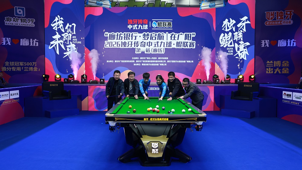 致辭結(jié)束后,開幕式迎來激動人心的開球儀式。廊坊市廣陽區(qū)政府區(qū)長王振宇、廊坊市體育局黨組書記劉武、廊坊銀行黨委書記、董事長崔建濤、獨牙控股集團董事長喬冰攜手球員代表姜旭桐、邢開杰共同手持球桿,在全場倒計時中合力開球,清脆的撞擊聲在館內(nèi)回蕩,標志著“廊坊銀行·夢啟航|在廣陽”2026獨牙傳奇中式九球·鯤聯(lián)賽第一站(廊坊)正式開賽。