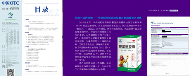 2025年3月,都梁軟膠囊正式獲得新加坡衛(wèi)生科學局(HSA)藥品注冊批件,已在新加坡的新中、裕華國貨、OG Guardian及眾多主流中藥行與商超上架銷售,讓現(xiàn)代中藥切實服務于海外民眾的健康需求。而近日,都梁軟膠囊入選中國非處方藥物協(xié)會2025年度OTC行業(yè)企業(yè)大事記征文,以《創(chuàng)新中成藥出?!A森制藥都梁軟膠囊在新加坡上市銷售》為題展出。這是行業(yè)對其臨床價值與國際化探索的雙重肯定。